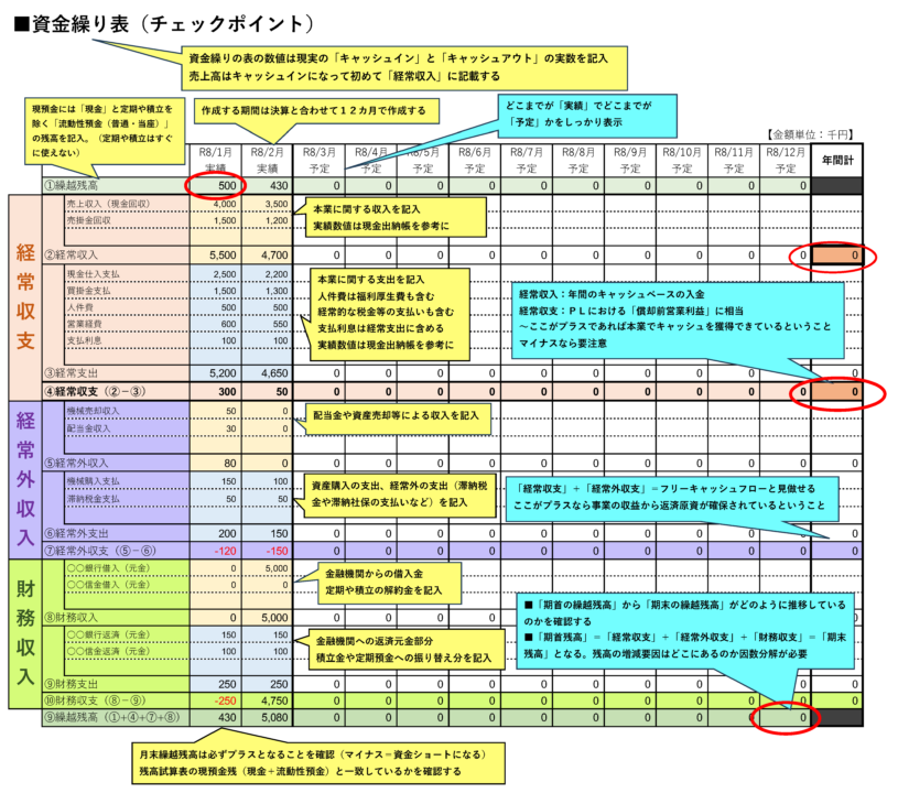 資金繰り表には、すでに確定した実績と、これからの予定を必ず区別して記載します。